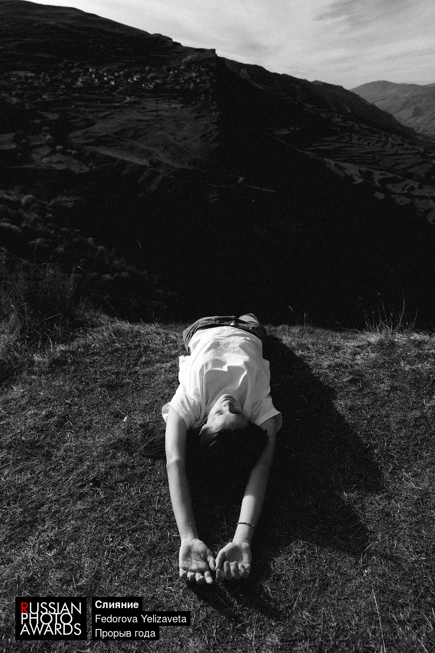 Черно-белое фото девушки, лежащей на траве с вытянутыми руками, на фоне горного пейзажа