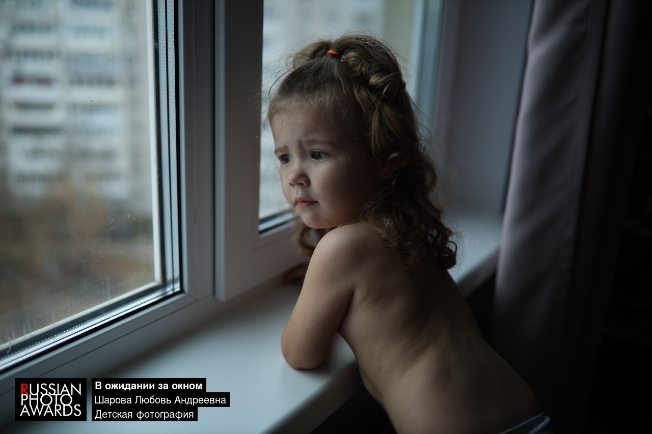 На фотографии запечатлена трехлетняя девочка с глазами полными тревоги и ожидания. За стеклом виднеется серый пасмурный день. В воздухе витает ощущение будто она ждет кого-то дорогого или переживает за что-то важное. На лице девочки сквозит детская наивность и беспокойство, что делает этот момент особенно трогательным.