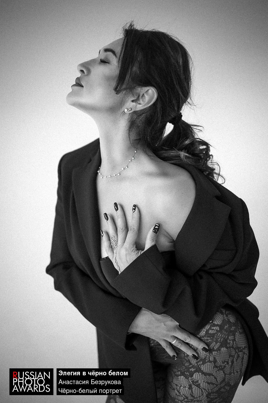 Момент чистой элегантности и внутренней силы. Женщина, облачённая в лаконичный чёрный пиджак, словно играет с гранями своей загадочности: пиджак небрежно распахнут, обнажая хрупкую линию ключиц и изящную цепочку на шее. Её поза — воплощение утончённой экспрессии: голова слегка запрокинута назад, глаза закрыты, будто она погружена в собственные мысли или ловит невидимую мелодию. Руки модели — отдельный акцент композиции: пальцы мягко лежат на груди, создавая ощущение одновременно уязвимости и уверенности.