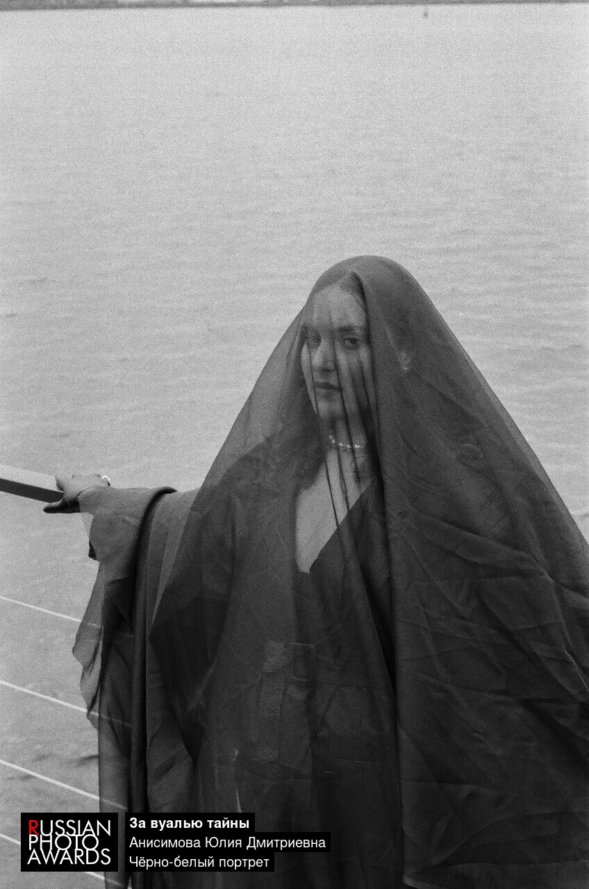 Глаза девушки полузакрыты, взгляд мечтательно устремлён вдаль, будто погружённая в собственные мысли и воспоминания.