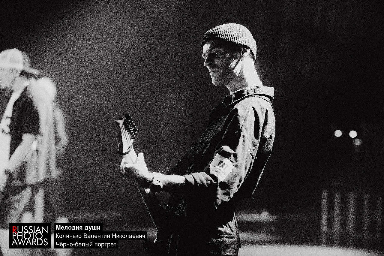 На фотографии запечатлен момент живого выступления гитариста, полностью погруженного в музыку.