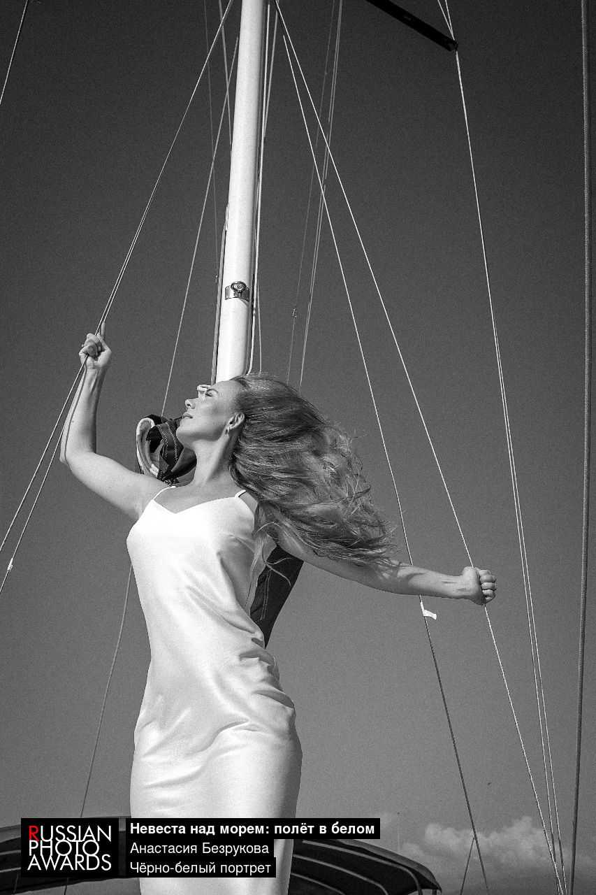 Яркие солнечные лучи льются сверху, создавая контрастные тени подчёркивая силуэт невесты. В её позе — свобода и лёгкость. Она словно парит над миром, окутанная солёным морским воздухом и солнечным светом.