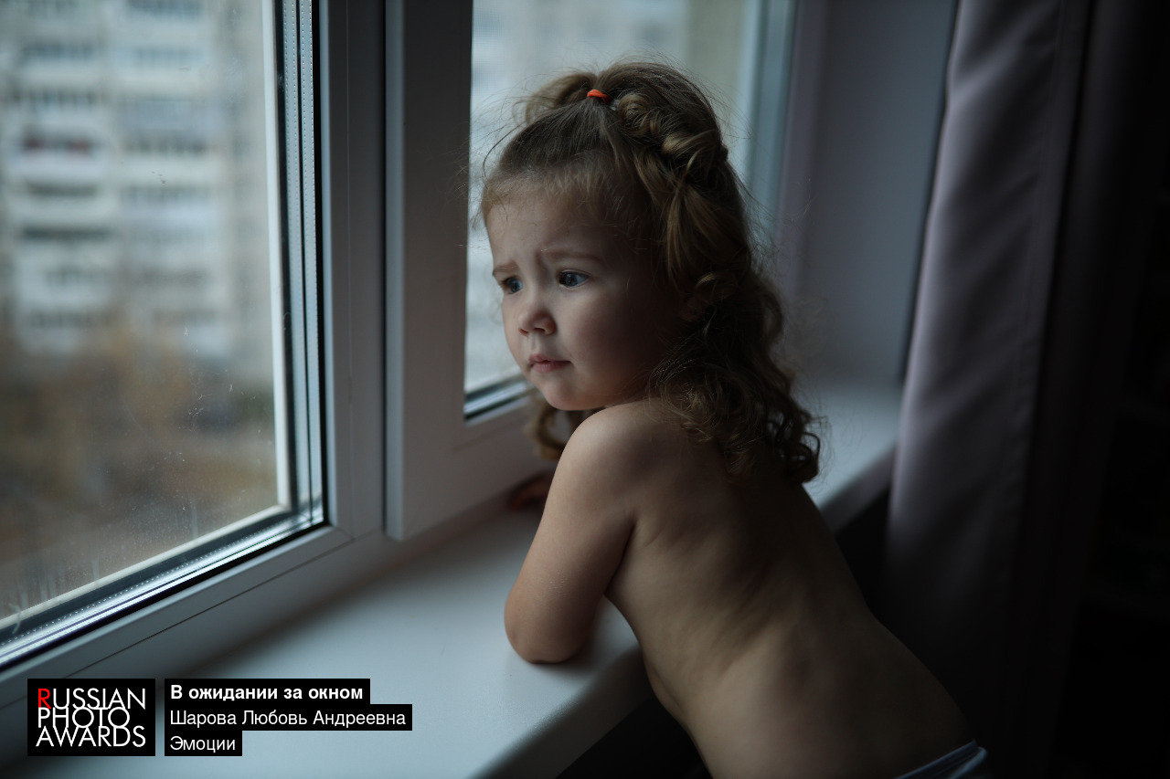 На фотографии запечатлена трехлетняя девочка с глазами полными тревоги и ожидания. За стеклом виднеется серый пасмурный день. В воздухе витает ощущение будто она ждет кого-то дорогого или переживает за что-то важное. На лице девочки сквозит детская наивность и беспокойство, что делает этот момент особенно трогательным.