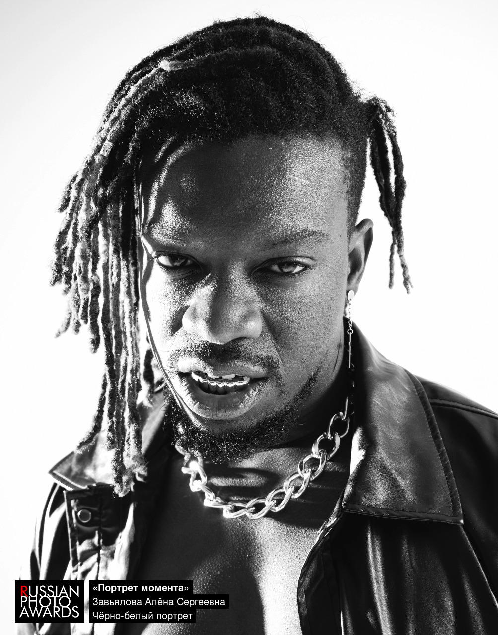 Черно-белый портрет, сделанный в моменте , палитра черно-белых цветов подчеркнула детали и текстуру лица , контрастность обозначила выразительность и характер.