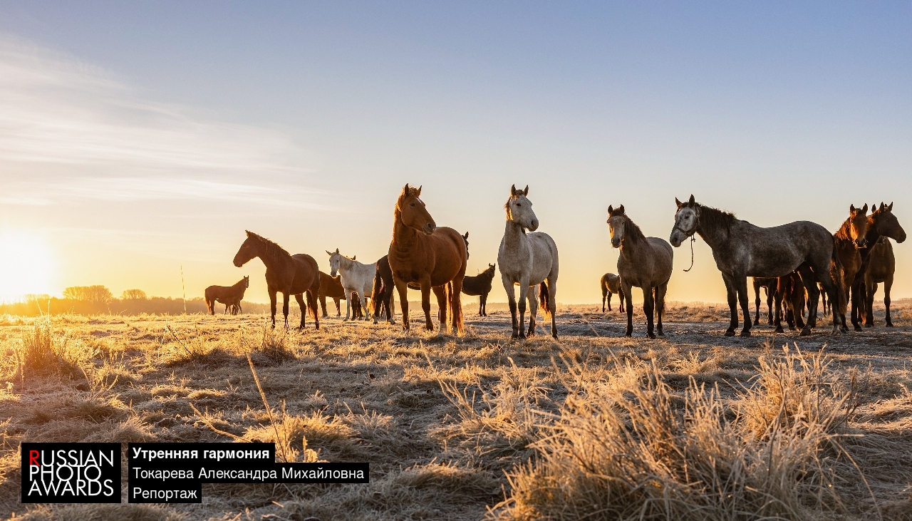 Это фото я сделал рано утром, когда первые лучи солнца только начали освещать поле. Лошади в кадре находятся в естественной, непринуждённой обстановке, что позволило мне передать их свободу и красоту в полной мере. Морозный иней на траве и мягкий свет создают особое настроение — спокойствие и свежесть нового дня.