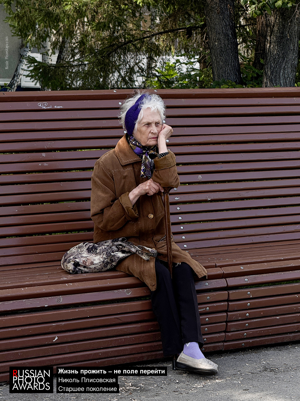 Возможно кто-то скажет, что это бабушка, а не женщина или дама, как я написала, но я с этим не соглашусь. Истинная женщина всегда следит за собой даже в мелочах. Посмотрите, как подобраны по цвету одежда и аксессуары, ничего лишнего, просто и достойно! Аккуратно прибраны густо-фиолетовой повязкой волосы, красиво завязан шарф, дополняющая образ сумка из гобелена. И даже тросточка смотрится не как опора при хождении, а как элемент стиля. Поза, осанка, взгляд, в котором читаются мысли о жизни. А дожить до такого солидного возраста и сохранить себя, внутреннюю силу и красоту дорогого стоит.