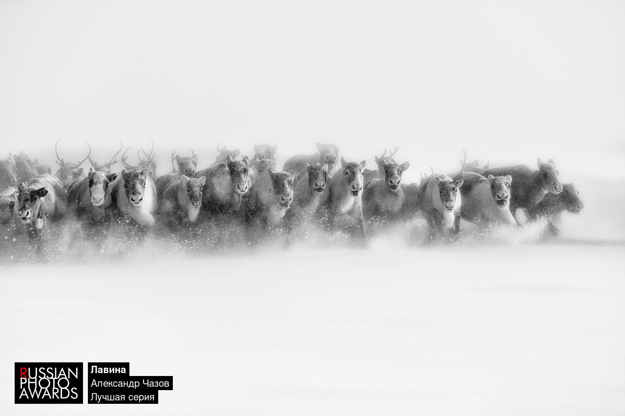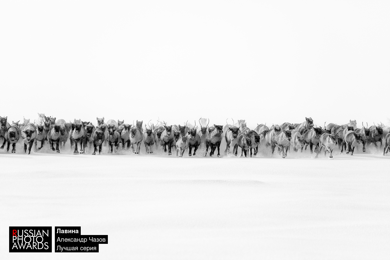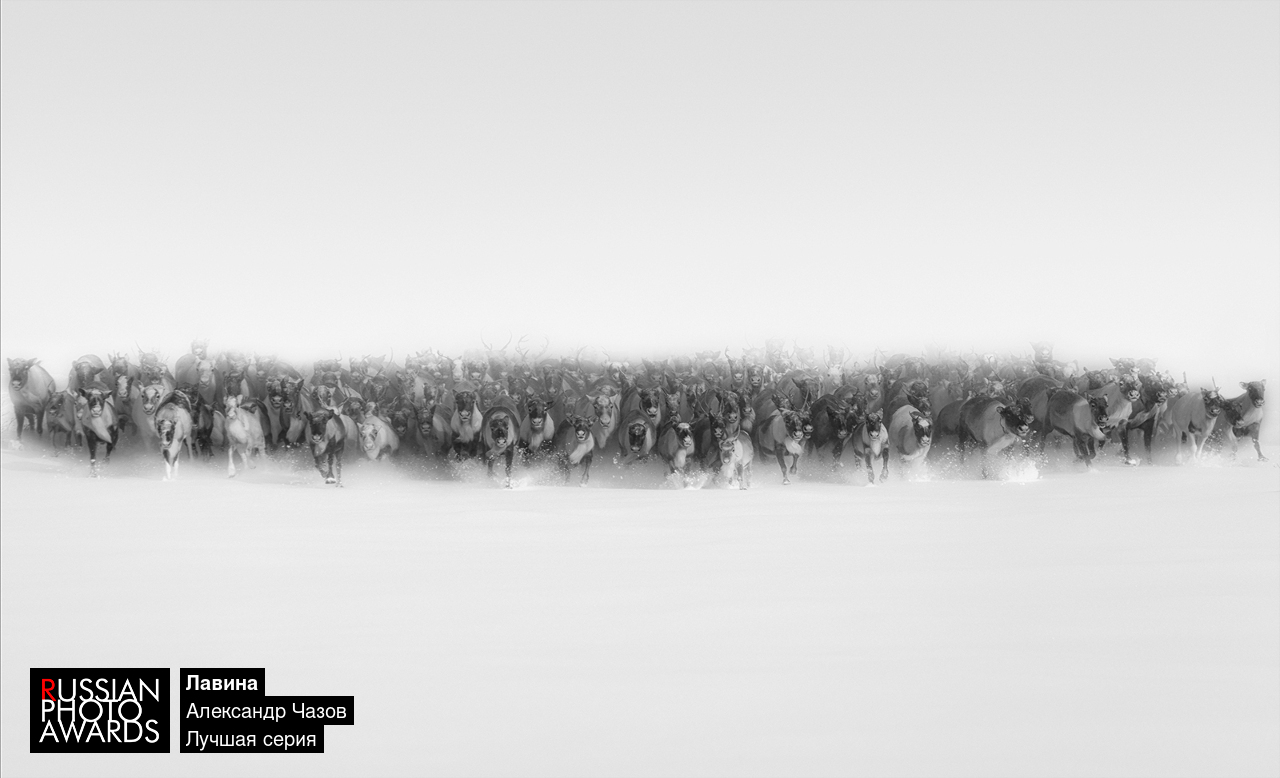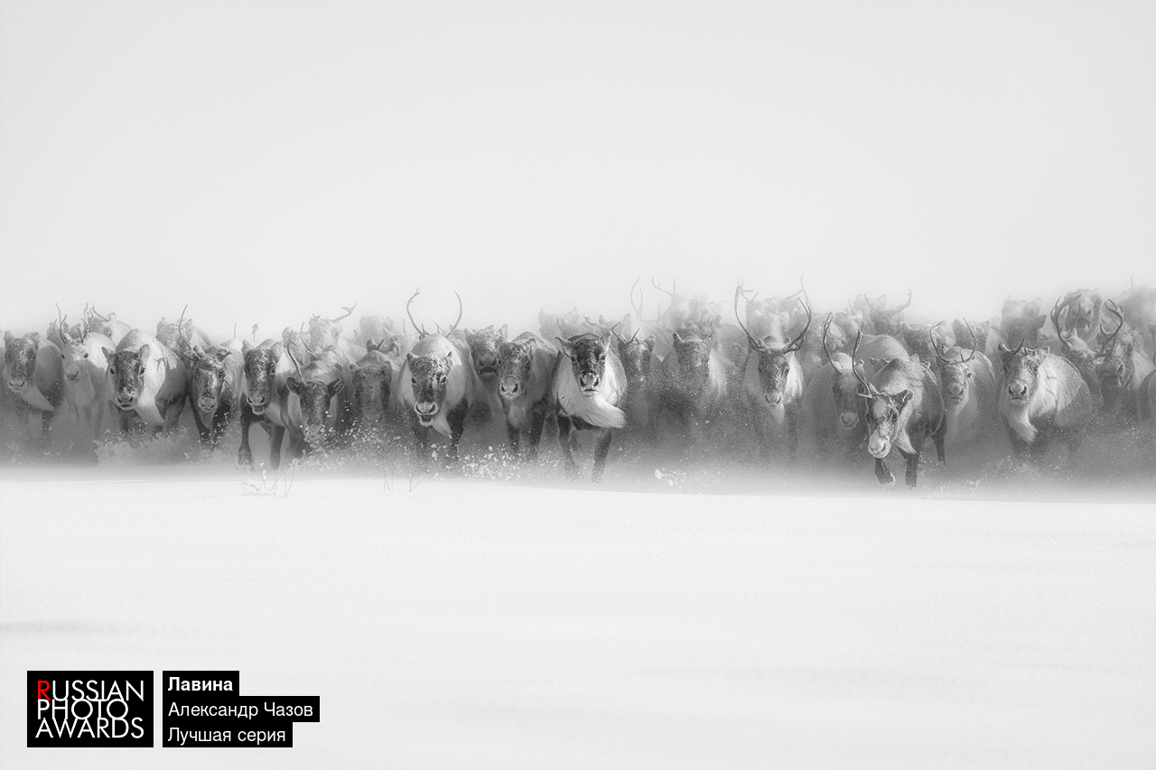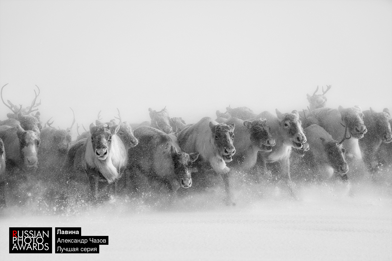 Стадо северных оленей надвигается в поднимаемой снежной пыли и горячем дыхании, словно в тумане по тундре.