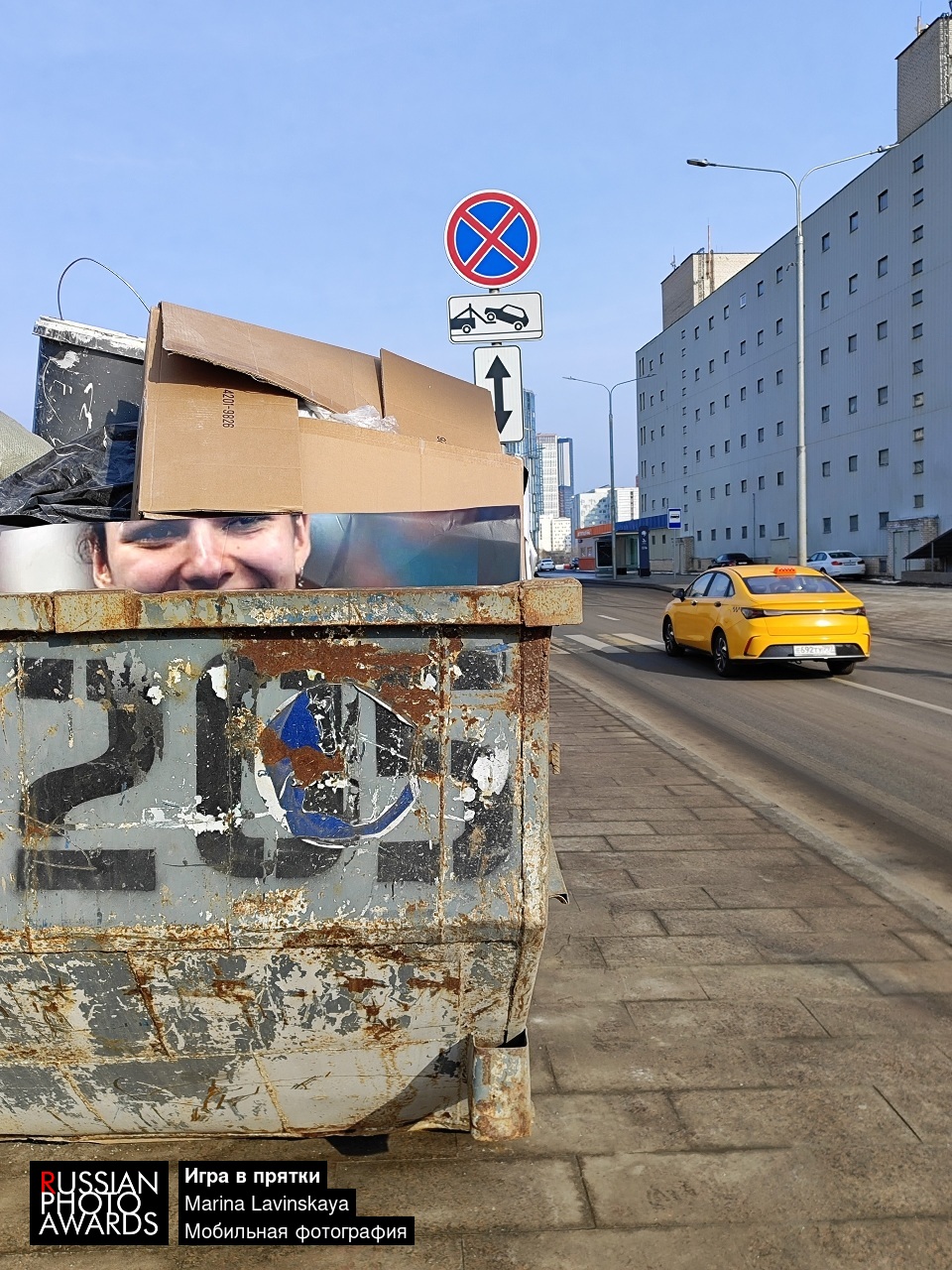 Однажды я проезжала мимо стройки и вдруг поймала эту улыбку девушки из контейнера со стройматериалами... Пришлось припарковаться и вернуться, поскольку этот сюжет меня бы не отпустил) Он и забавный, и грустный. Зависит от интерпретации и во многом от погоды. Было ясное, чистое, голубое небо и так не хотелось грустить! Я постаралась сделать сюжет более оптимистичным, дождавшись в кадре жёлтое такси и дав этому кадру название "Игра в прятки"))