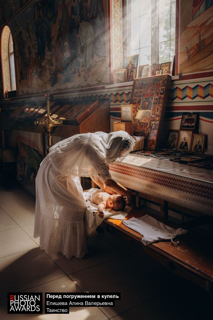 Крестная мама раздевает малыша перед погружением в купель. Храм святых блаженных Матроны Московской и Ксении Петербургской, г. Курск
