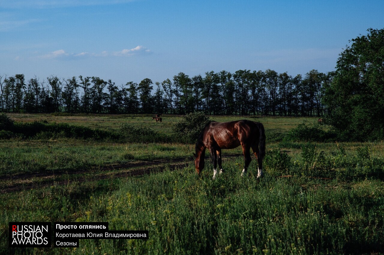 Вдали, на заднем плане, другая лошадь, словно силуэт, медленно двигается, а за ней — тень деревьев, которая создает контраст с ярким небом и открытым пространством. Эти деревья — не просто часть пейзажа, а как будто наблюдатели, хранители этого мира, словно сотни лет стоящие в том же месте, впитывающие солнечные лучи и ночные тени.
