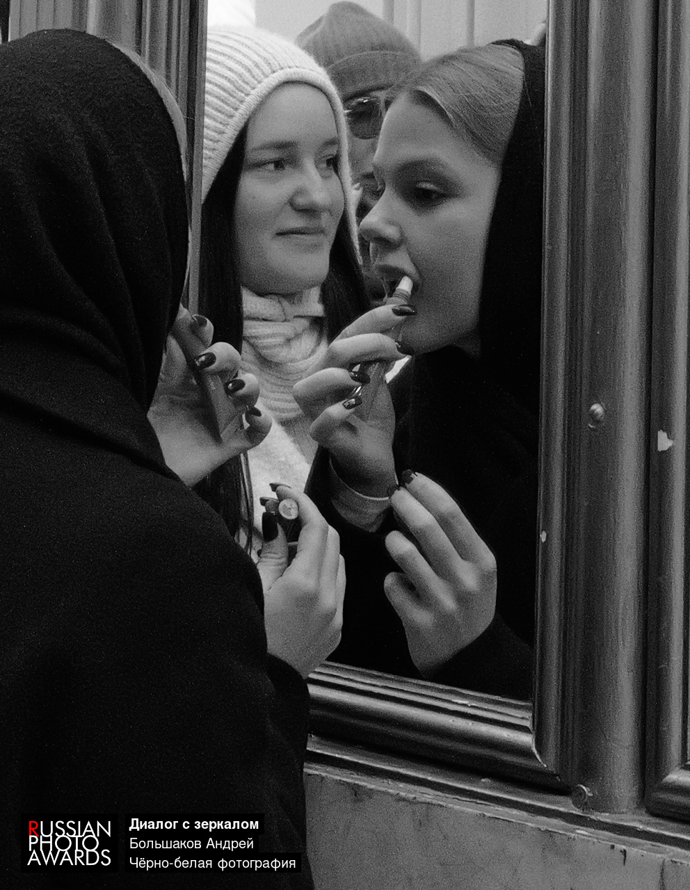 Это фотография о границе между личным и публичным, о мгновении перед выходом, когда человек ещё принадлежит себе. О зеркале как месте честности — где встречаются лицо и отражение, реальность и ожидание.