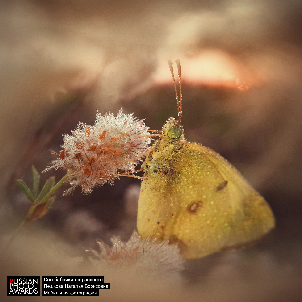 Бабочка желтушка луговая в каплях росы на фоне восходящего солнца.