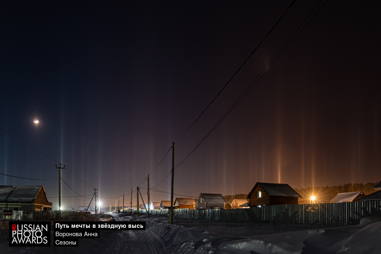 В морозной тишине ночи рождаются световые столбы — словно невидимые пути, по которым мечты устремляются к звёздам. Они поднимаются от земли, превращая обычный свет в волшебные колонны: будто каждая мечта находит путь к исполнению через хрустальные призмы ледяных кристаллов. Каждый световой столб — след летящей мечты, застывший в воздухе. Он тянется к бескрайнему небу, превращая человеческие желания в нечто величественное. Кажется, что мечты обретают форму и свет, становясь частью ночного неба. Световые столбы символизируют связь земного и небесного: как свет, проходя через кристаллы, создаёт чудо, так и наши мечты, преодолевая препятствия, могут достичь цели. В каждом столбе — надежда на исполнение желаний, а в каждом желании — сила создать чудо. Эта природная красота напоминает о чистоте и возвышенности мечтаний. Пока существуют световые столбы, живёт вера: у мечтаний есть путь к звёздам, а у волшебных ночей — сила исполнения желаний.