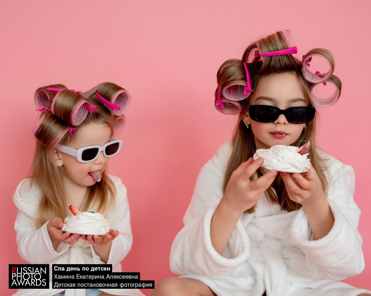 На фотографии две девочки в белых халатах сидят на фоне розовой стены и с улыбкой едят десерты. Их причёски с крупными бигуди создают атмосферу домашнего спа‑дня и беззаботного отдыха.