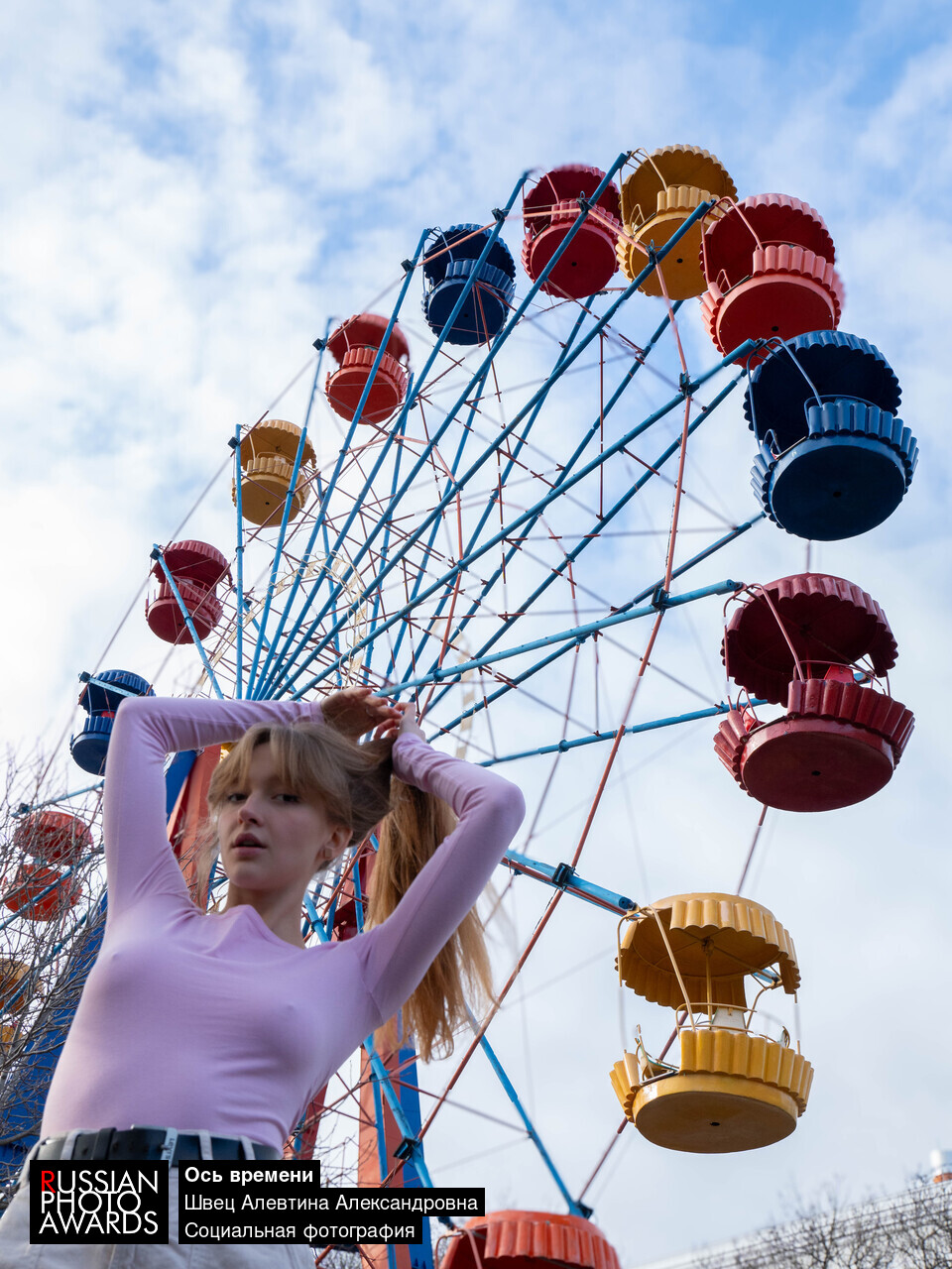 Девушка на фоне колеса обозрения словно застывший момент во времени, где прошлое, настоящее и будущее переплетаются в круговороте движения. Фотография сделана в Севастополе. Этому колесу обозрения больше 40 лет и за это время в самом городе почти ничего не изменилось.