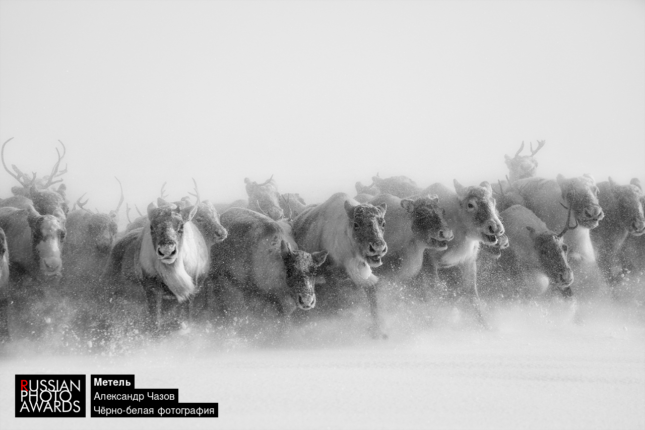 Стадо северных оленей надвигается в поднимаемой снежной пыли и горячем дыхании, словно в тумане по тундре.