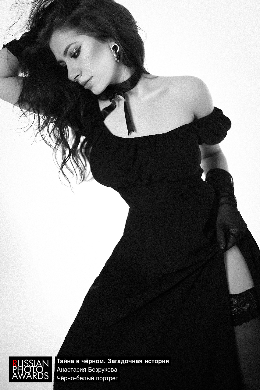 Она слегка наклонила голову и посмотрела вниз. В её задумчивом взгляде читались отголоски давних событий, известных только ей. Чёрные перчатки, кружевные чулки и чокер с крошечным амулетом подчёркивали связь с чем‑то потусторонним — амулет казался не украшением, а оберегом, сдерживающим некую силу. Лёгкий разрез на платье приоткрывал ногу, напоминая: она не пленница своих тайн.