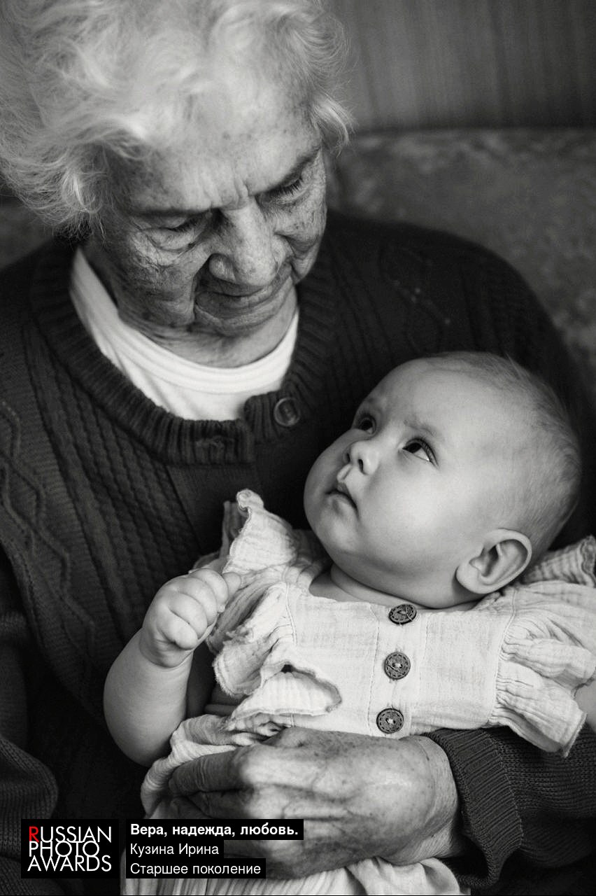 В морщинистых руках девяностолетней прабабушки — нежный комочек жизни: шестимесячная внучка Вера. Их взгляды внезапно встречаются — прямой, доверчивый у малышки и полный тихой мудрости у прабабушки. В этом мгновении запечатлён вечный круг: конец одной жизни нежно обнимает начало другой.