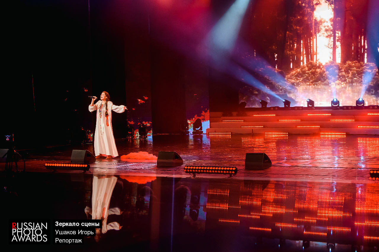 Отражение сцены становится метафорой воды - как будто звук и свет колеблют её поверхность. Исполнительница будто парит между реальностью и отражением, превращая сцену в пространство чувств. Фотография фиксирует мгновение сценической магии — документ живого искусства, где реальное и отражённое сливаются в одно, рождая ощущение глубины и присутствия.