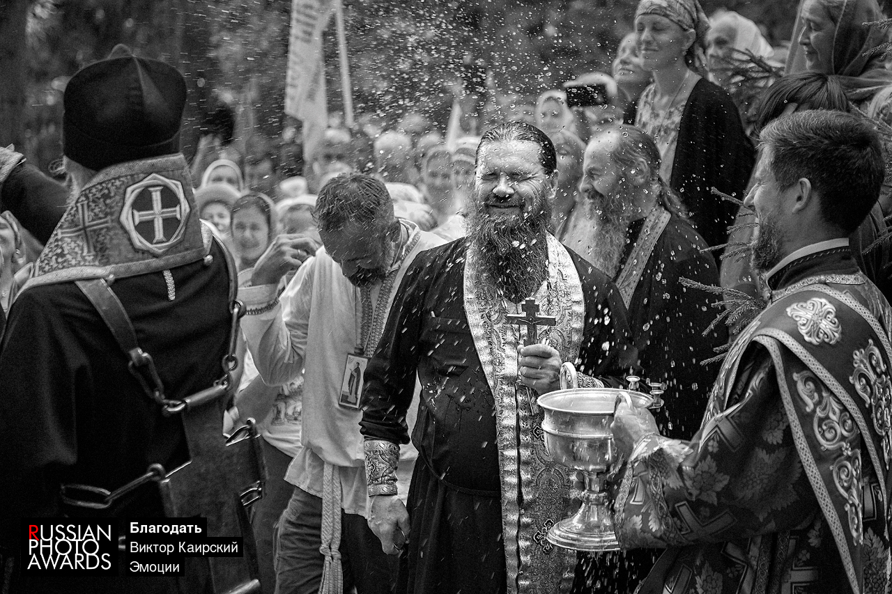 Снимок сделан в период проведения Иринарховского крестного хода, одного из самых популярных крестных ходов России. Ежегодно в нем принимают участие более двух тысяч паломников, а длится он пять дней. Крестный ход проводится в честь преподобного Иринарха затворника. В завершающий день на источнике преподобного Иринарха, близ с. Кондаково в Ярославской области, проводится водосвятный молебен. На фото запечатлен один из эмоциональных моментов молебна.