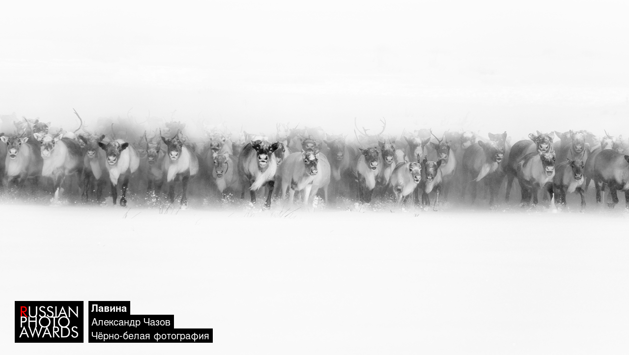 Стадо северных оленей надвигается в поднимаемой снежной пыли и горячем дыхании, словно в тумане по тундре.
