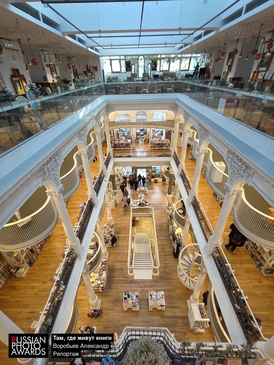 На фотографии представлен интерьер книжного магазина Cărturești Carusel в Бухаресте, Румыния. Это здание XIX века, которое было отреставрировано и превращено в одно из самых красивых книжных пространств.