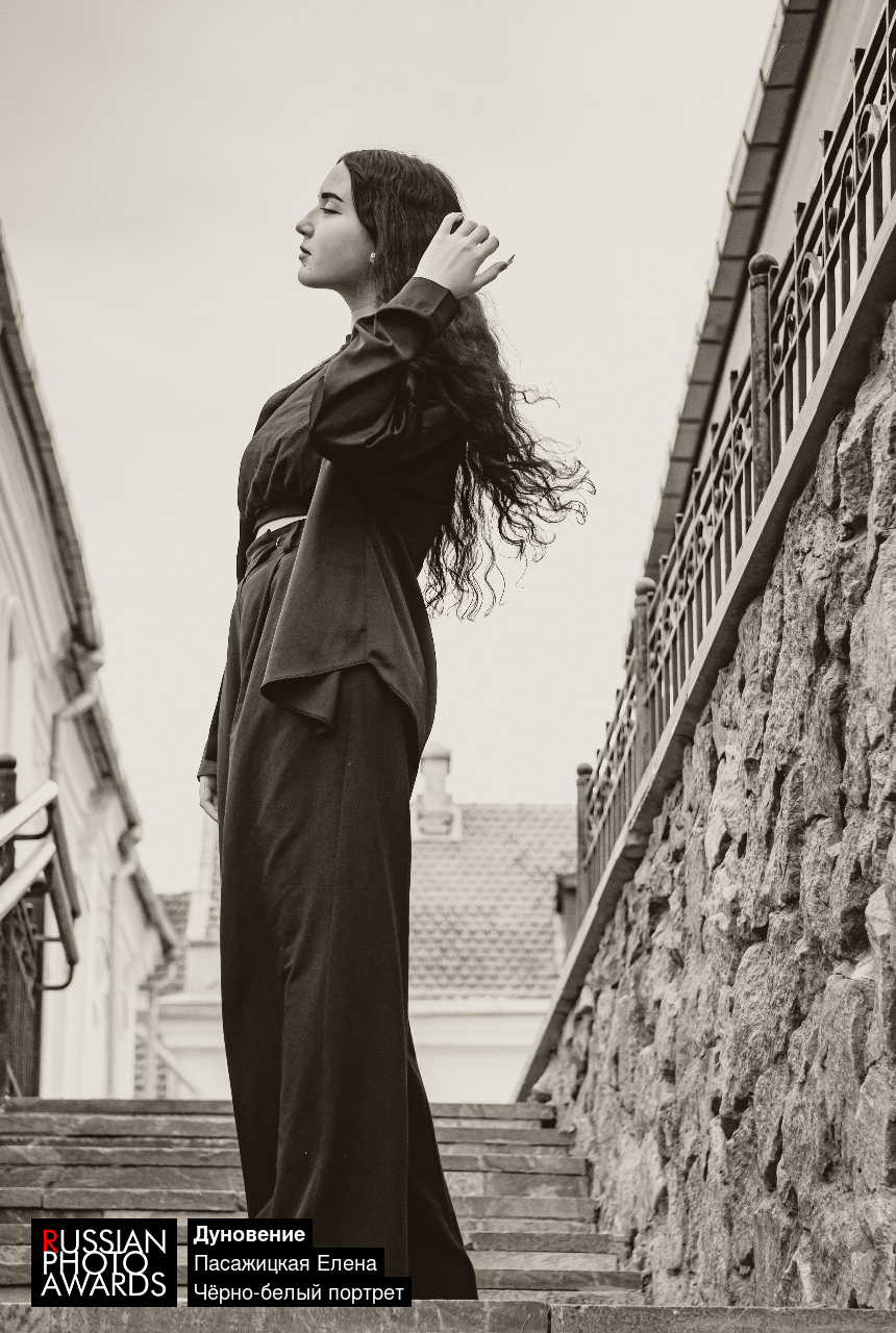 Фотография передаёт хрупкий момент соприкосновения человека и пространства — мгновение, когда движение воздуха становится продолжением внутреннего состояния. Женская фигура на ступенях словно застывает между землёй и небом, между покоем и движением. Лёгкое касание ветра оживляет волосы и ткань, создавая ощущение внутренней свободы и тихой силы.