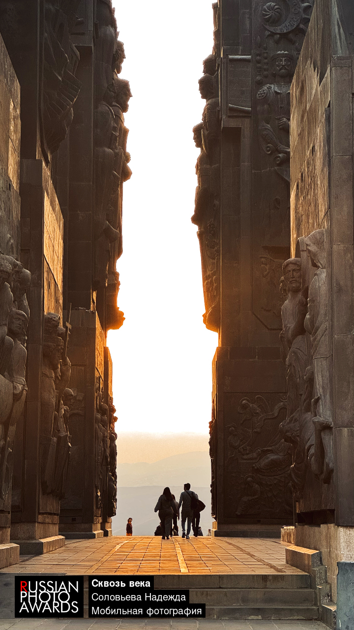 Два человека идут вперёд, навстречу свету, проходя между массивными каменными фигурами, застывшими во времени. Здесь прошлое словно наблюдает за настоящим, а человек остаётся маленьким, но живым — движущимся, чувствующим, настоящим.