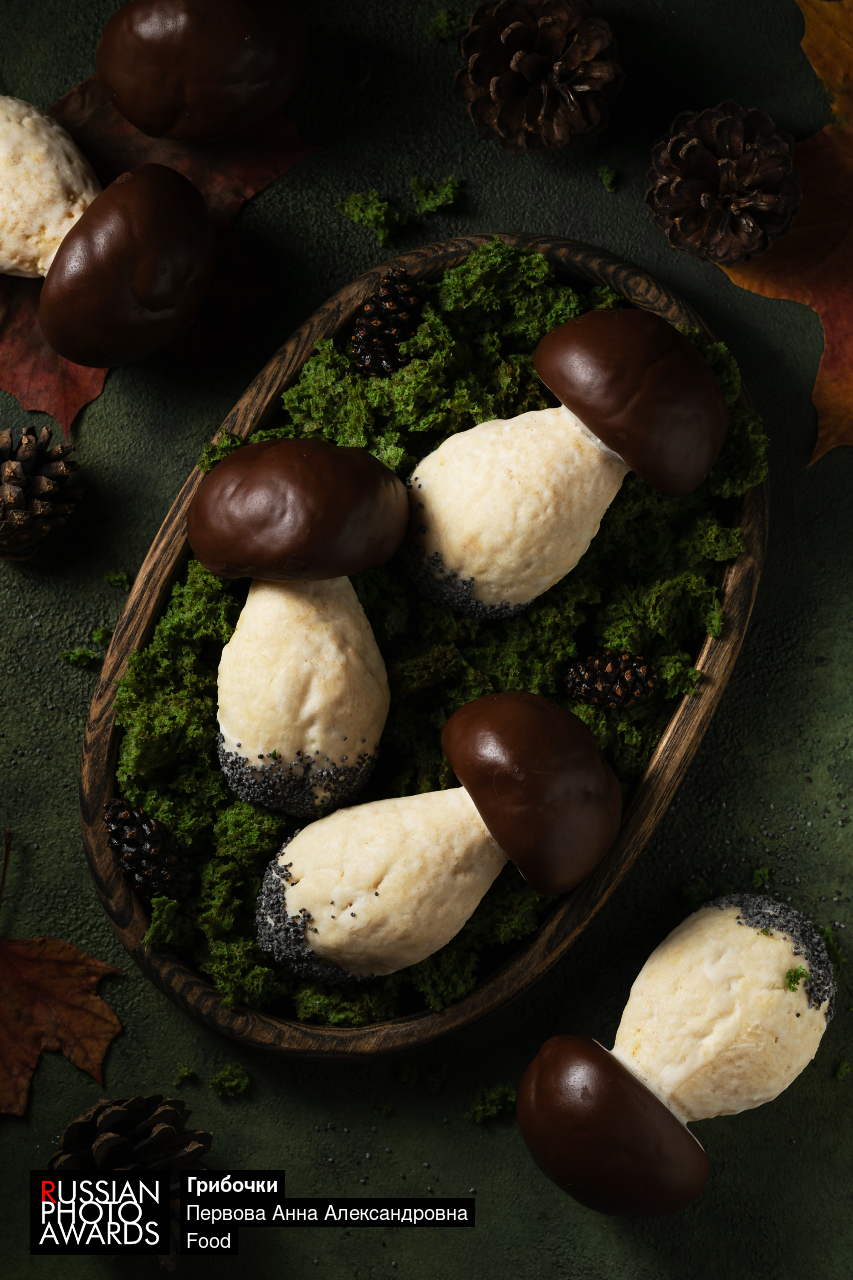 Песочное печенье в виде белых грибов на подушке из съедобного бисквитного мха