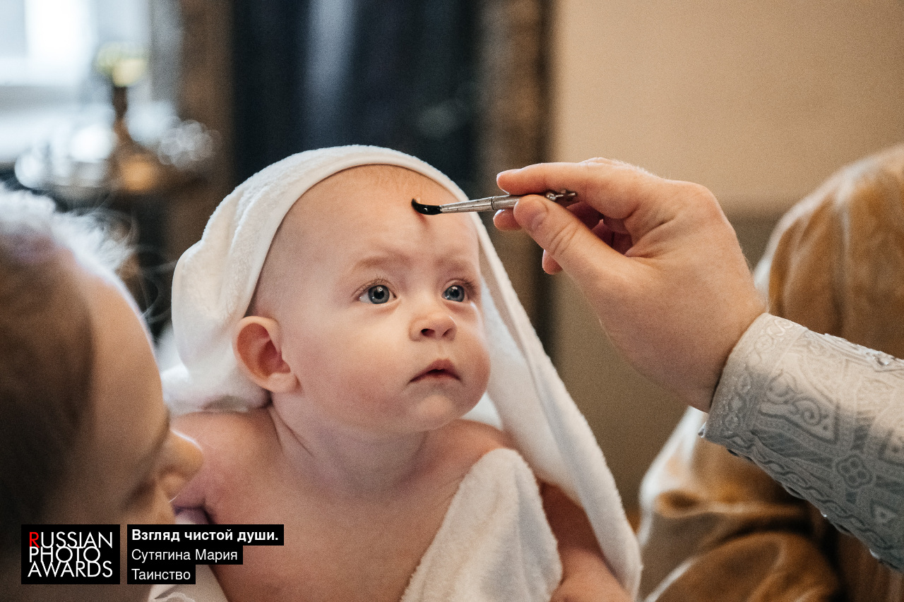 Священник аккуратно наносит миро на лоб маленькой малышки во время таинства Крещения, символизируя её духовное просвещение и принятие в церковную общину. А малышка в это время смотрит батюшке прямо в глаза своим невинным и чистым взглядом.