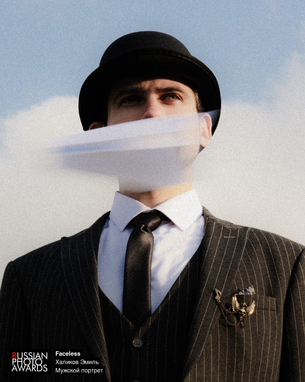 Заглавная работа из серии Faceless, вдохновлённой Рене Магриттом и Родни Смитом. Главной задачей серии было скрыть или частично закрыть лица моделей различными объектами повседневности так же, как мы иногда теряем свою идентичность за повседневными активностями, делами и обстоятельствами.