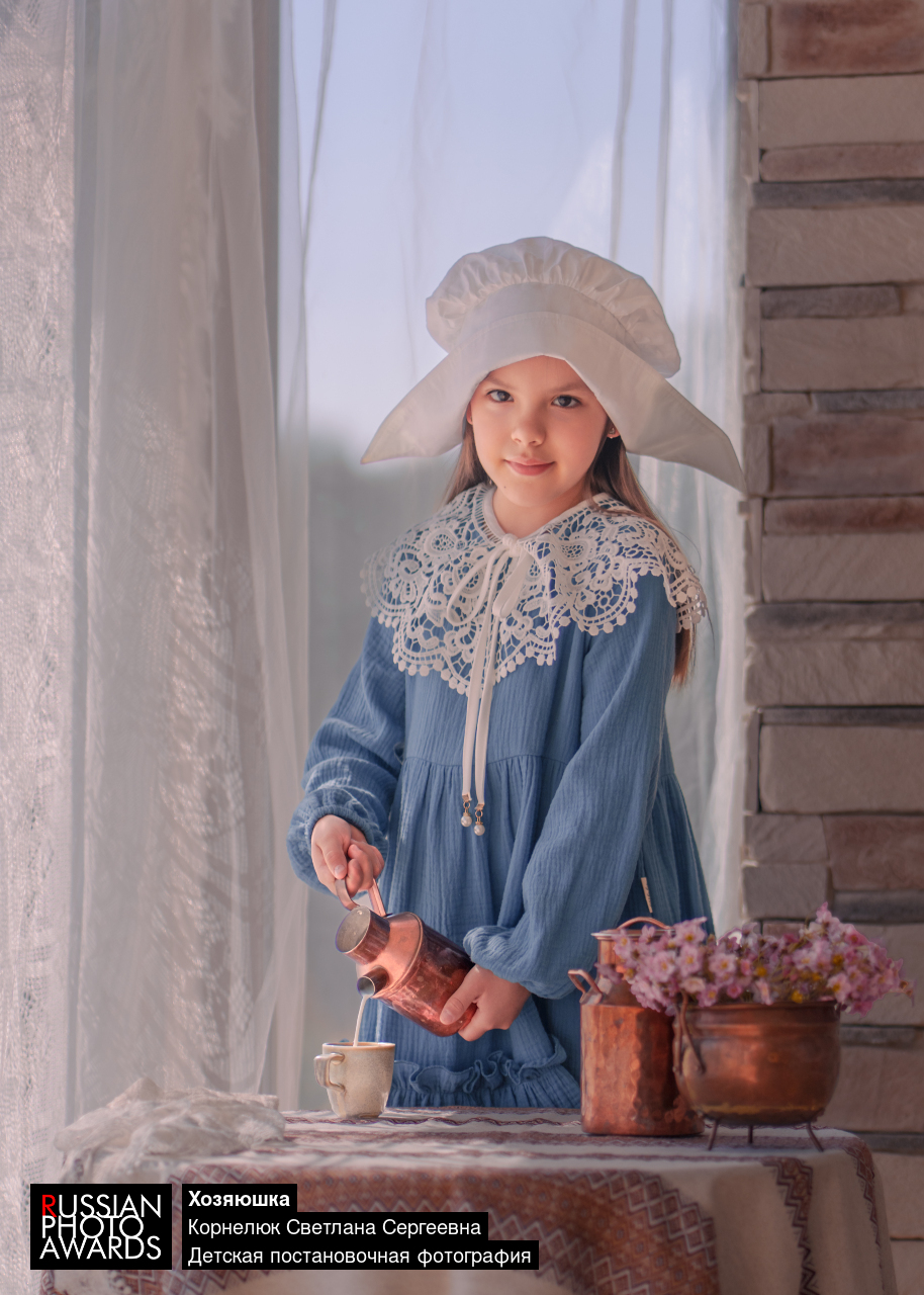 Словно сошедшая со старинной открытки, девочка в синем платье наливает молоко из блестящего медного кувшина. Её прямой и открытый взгляд и уютное убранство стола с цветами и посудой наполняют сцену жизнью и словно бы приглашают выпить чашку свежего молока.