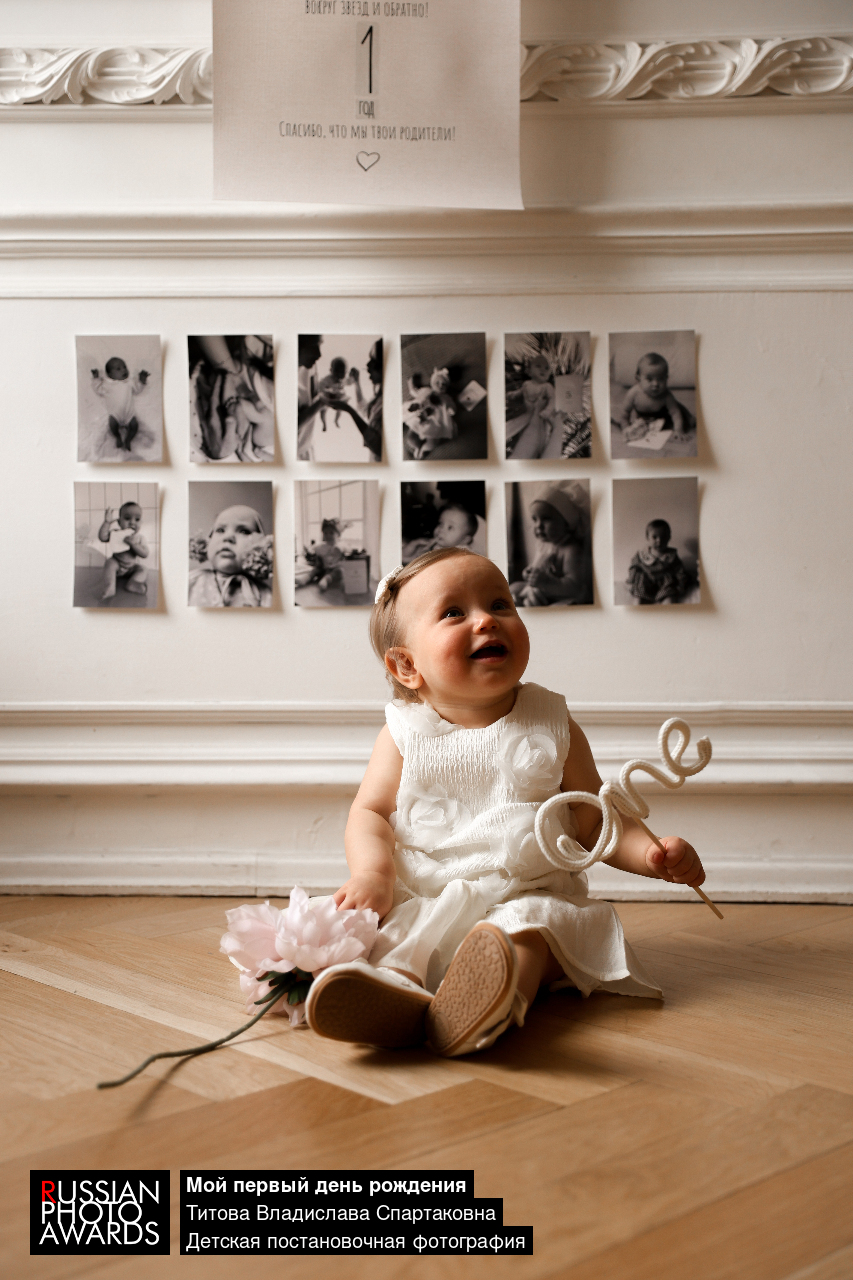 Малышка Софи на фоне своих фотографий, на которых изображен ее первый год жизни.