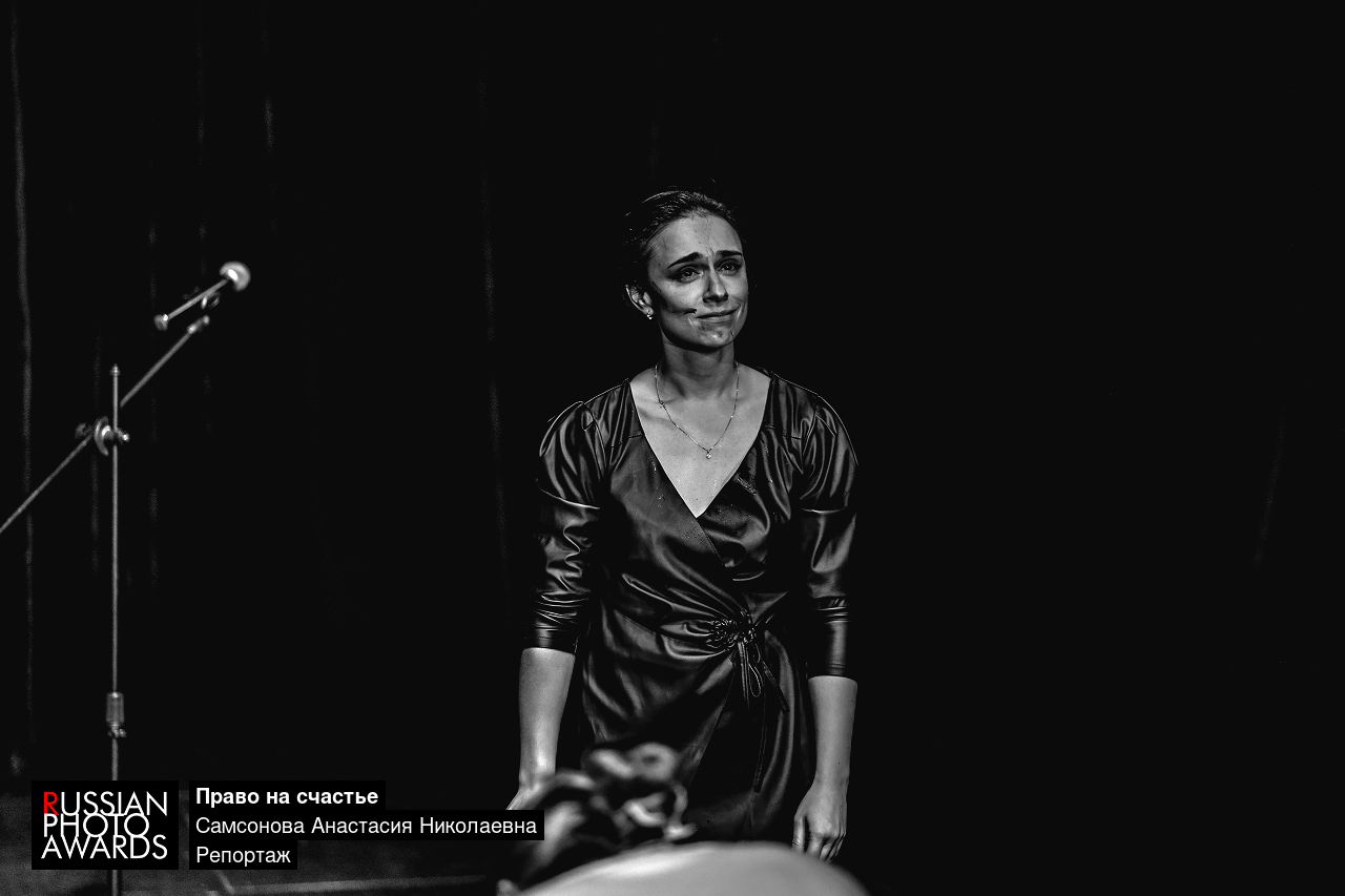 Елизавета Климчук на сцене во время моноспектакля. Выражение лица передают глубину переживаний и внутреннюю силу