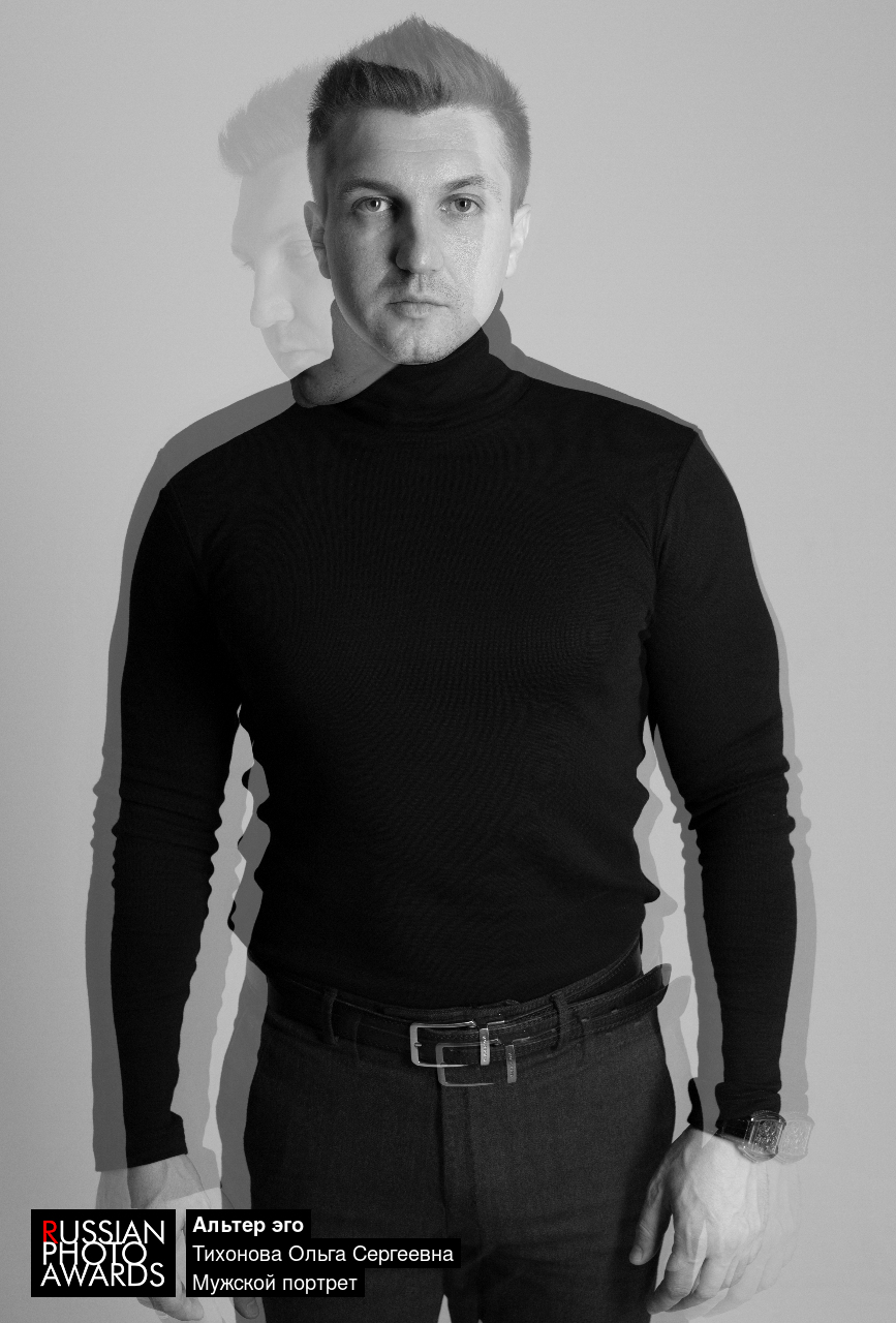 Диалог с самим собой. Строгий взгляд в камеру — социальная роль и контроль. Призрачное очертание, отвернувшееся в сторону, — внутренний голос и свобода. Черно-белая гамма обнажает конфликт между «персоной» и «душой». Какое из двух «я» настоящее — решать зрителю.