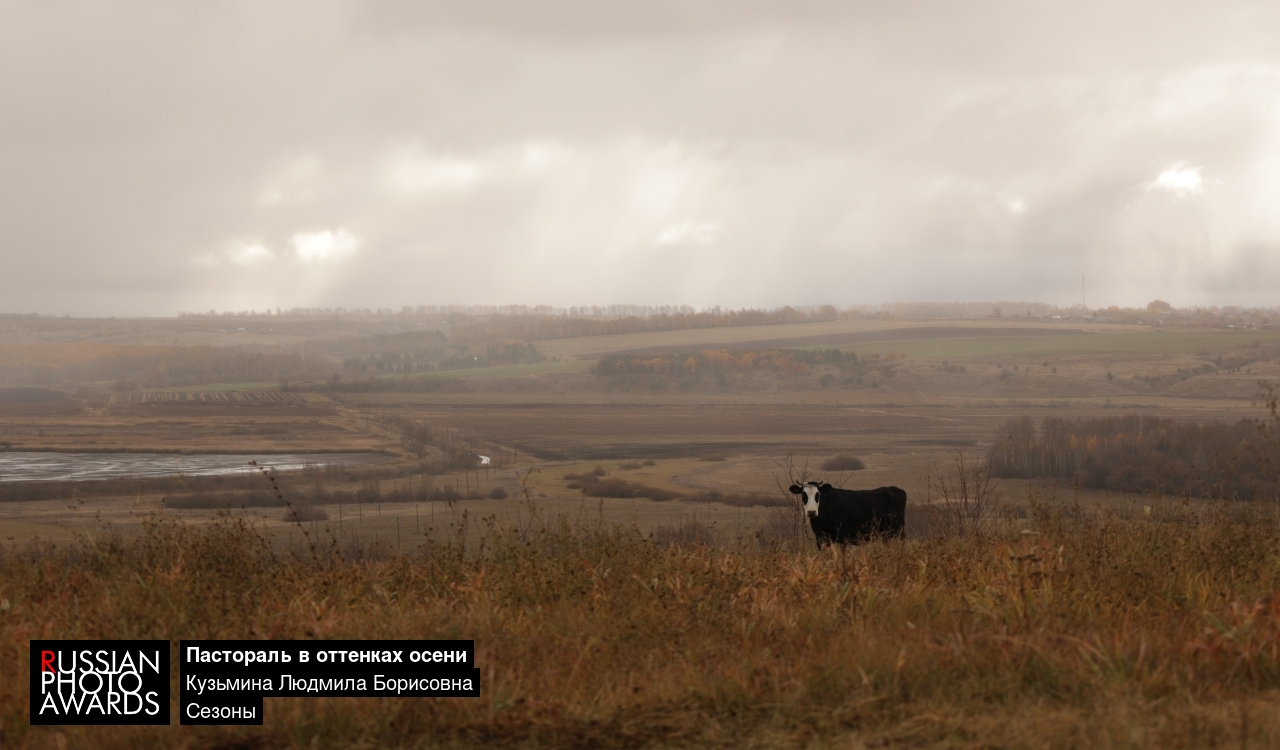На фотографии запечатлена корова, одиноко стоящая на фоне осеннего пейзажа. Поле покрыто сухой травой, а вдали видны размытые силуэты деревьев и холмов. Небо затянуто облаками, создавая атмосферу умиротворения и задумчивости.