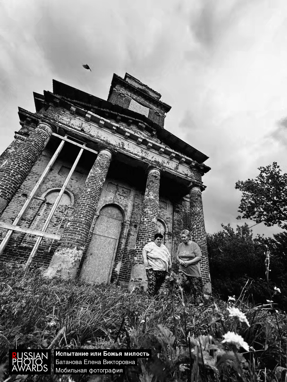 Пожилая мама со своей взрослой дочерью , которая навсегда будет ребёнком , у входа в старую заброшенную церковь .