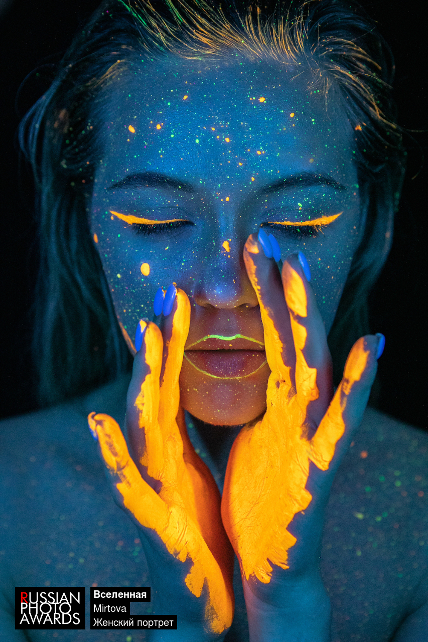 Когда свет не снаружи, а внутри тебя. Портрет создан при неоновом освещении, где краска светится и передает атмосферу космоса.
