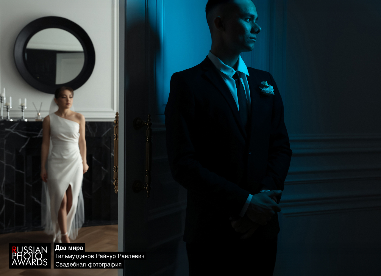 Кинематографическая глубина кадра, построенная на осознанном управлении фокусом. Бритвенная резкость на женихе, подсвеченном драматичным синим контровым светом, «якорит» реальность. В то же время невеста на дальнем плане намеренно оставлена в мягком расфокусе, превращаясь в эфирное, теплое видение. Это визуальная метафора того, как реальность замирает в ожидании мечты.