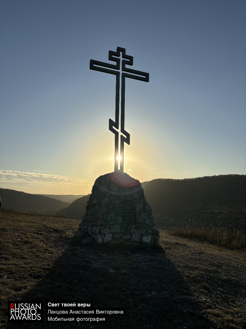 Солнечный свет, пробивающийся сквозь крест Памяти и Покаяния в честь 2000-летия Рождества Христова в память владыки Санкт-Петербургского и Ладожского Митрополита Иоанна Снычева и всех тех, кто, не щадя живота своего, сложили голову за Великую Русь на горе Монастырская в с. Ширяево.
