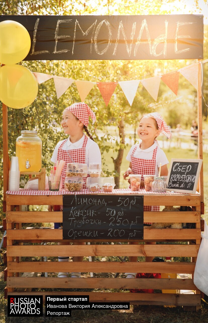 2 юные предпринимательницы продают лимонад и сладости в городском парке. На их лицах - восторг и радость.