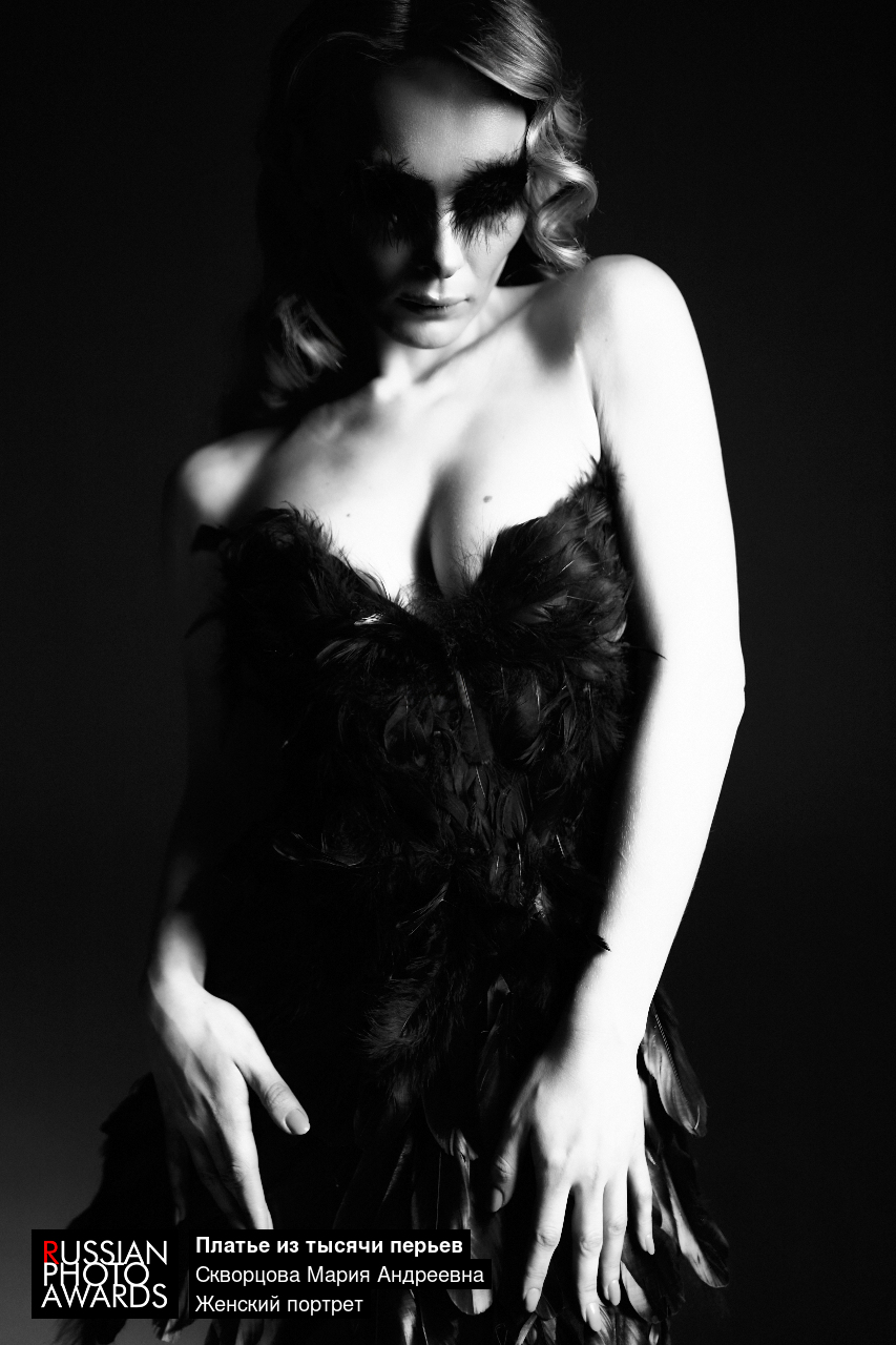 Черно-белый портрет девушки в платье из тысячи перьев. важно смотреть кадр целиком.