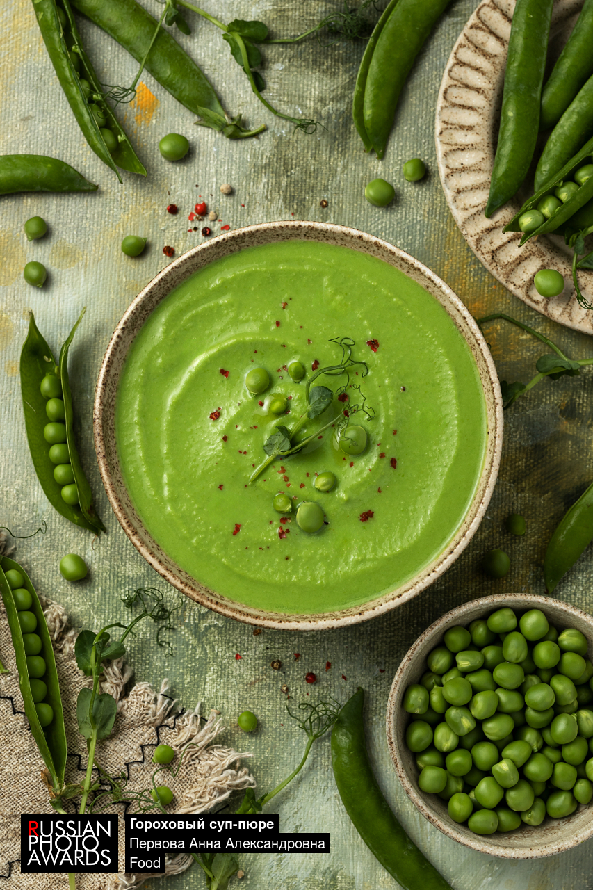 Композиция с ярким супом-пюре из свежего зелёного горошка