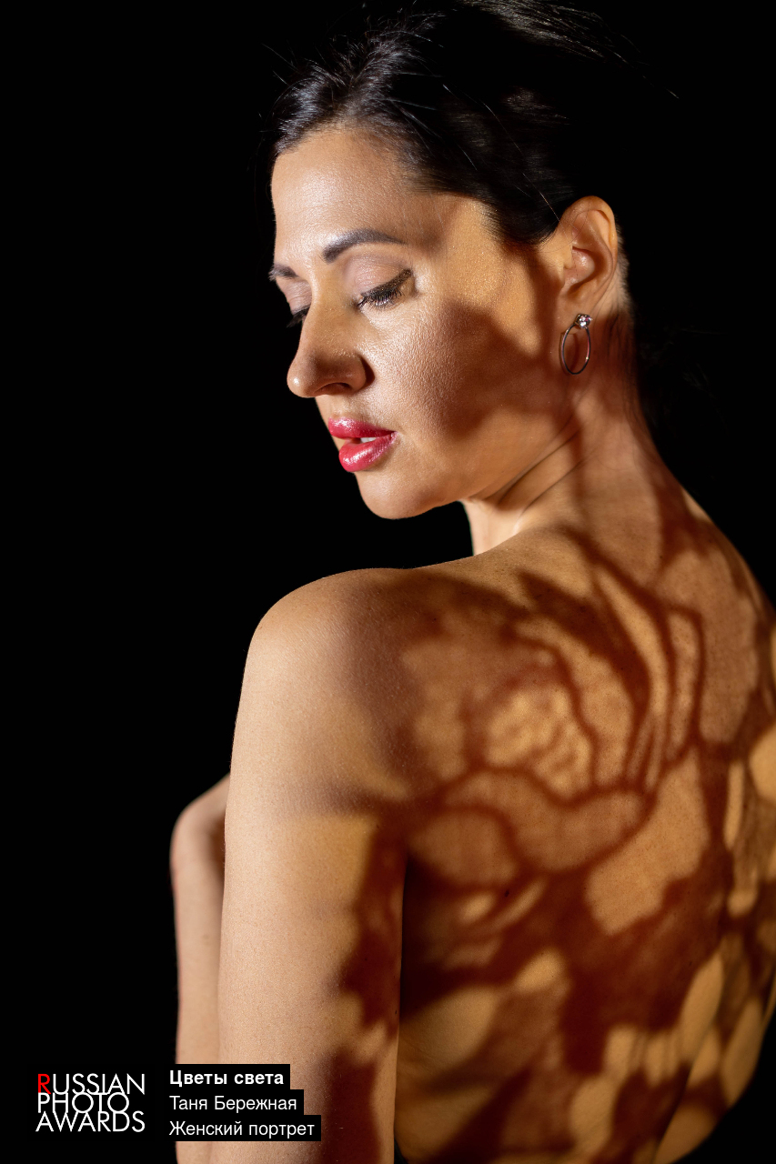 Тёплый свет мягко скользит по коже, создавая причудливый цветочный узор. Свет становится кистью, а девушка живым холстом.