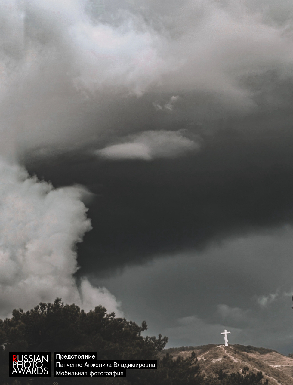 Над горой с белым крестом могучий тучеворот, состоящий из множества оттенков серого