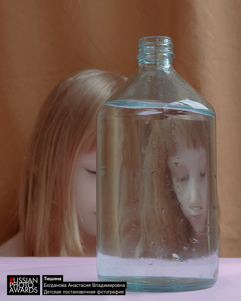 Образ ребёнка, преломлённый водой в стеклянной бутылке, превращается в мягкое, искажённое отражение — метафору внутреннего мира и хрупкости восприятия. Снимок исследует, как простая оптическая иллюзия может раскрыть тихую глубину детского состояния.