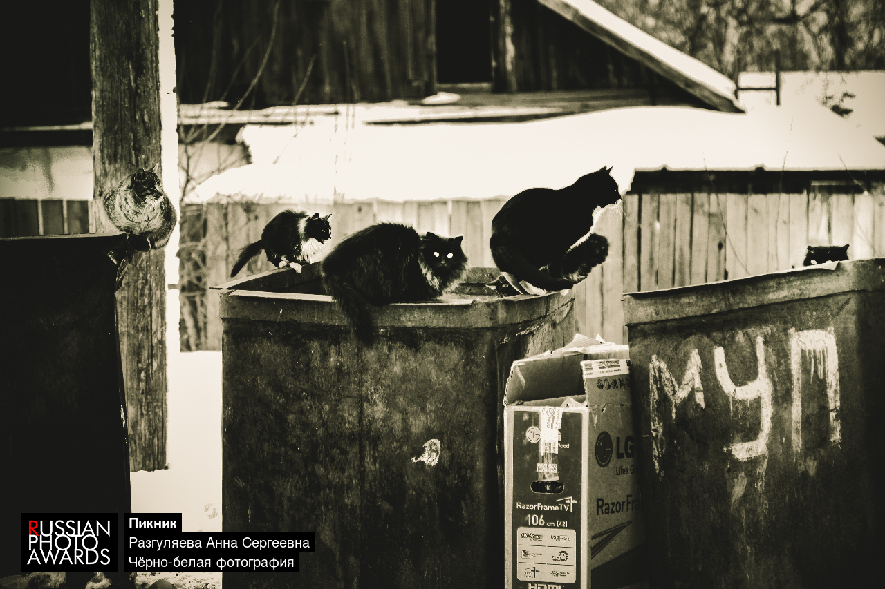 Уличная жизнь старой деревни переносит нас в мир простоты и обаяния. Мусорные контейнеры, ставшие своеобразной аркой для пяти любопытных котов, символизируют повседневную реальность, полную неожиданных встреч. На их верхушках царят эти голодные пушистые создания, уставившиеся на нас соим проницательным взглядом, будто задают вопрос и жизни, о том, что скрывается за пределами их уютного укрытия.