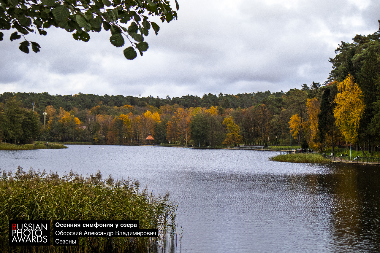 Спокойное осеннее озеро, окружённое золотистыми деревьями под пасмурным небом