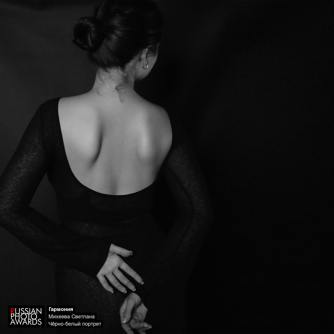 Эта фотография является воплощением спокойствия и внутренней гармонии. Тонкий контраст между светом и тенью плавно очерчивает изгибы обнажённой спины, придавая образу утончённое изящество. Загадочно собранные за спиной руки создают ощущение скрытой истории, которую зритель пытается разгадать. Простота композиции при этом наполнена глубиной чувств и тихой силой, словно момент застыл в вечности, приглашая к созерцанию и размышлению. Чёрно-белая гамма усиливает драматизм и подчёркивает текстуру ткани и кожи, делая снимок одновременно чувственным и камерным. Этот кадр — приглашение погрузиться в мир тихих переживаний и скрытых эмоций.