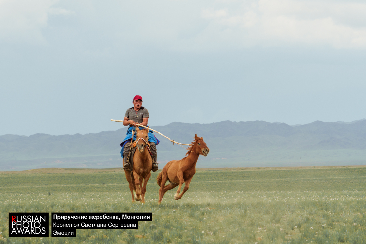 Случайная встреча с монгольской семьей кочевников позволила запечатлеть древний ритуал — отлов жеребенка. Опытный всадник, догоняя малыша на лошади, мастерски набрасывает лассо, демонстрируя многовековые навыки кочевой жизни. В этом слаженном действии, где участвует вся семья, проявляется не просто необходимость, но и глубокая связь человека с животными и степью.